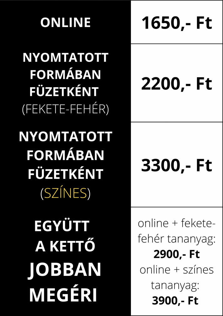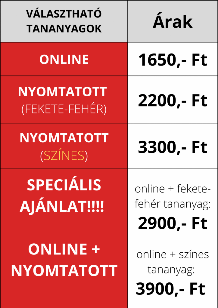 A tananyagokat az Ön kérésére fekete-fehér vagy színes nyomatban küldjük meg. A tananyagot az Ön választása szerint postán, futárral, vagy csomagpontra küldjük, amelynek költsége – a tananyag díjain felül – Önt terheli.